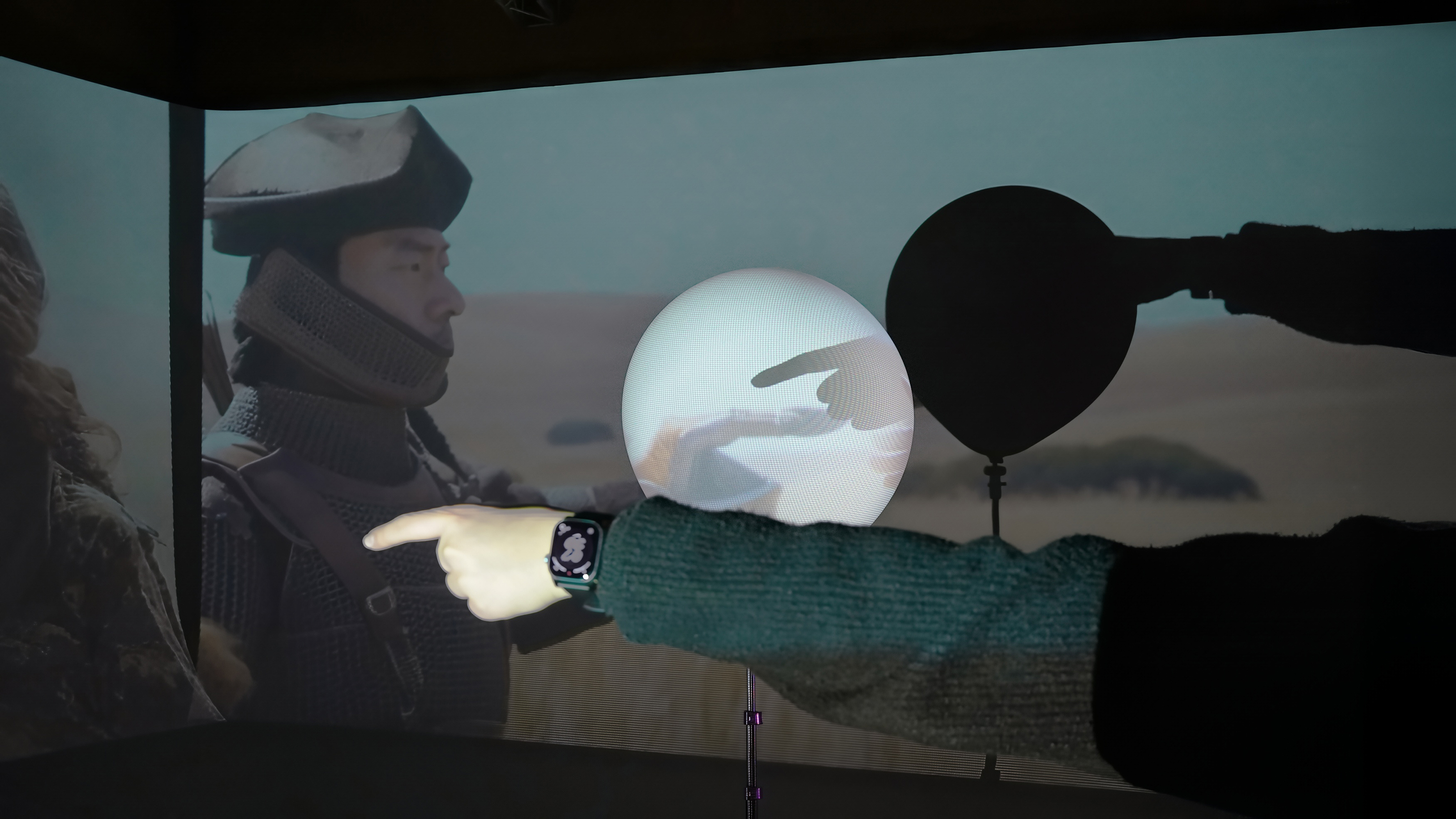 The hand gestures from separate projections were aligned toward the central object, establishing a spatial intersection between two projection surfaces.